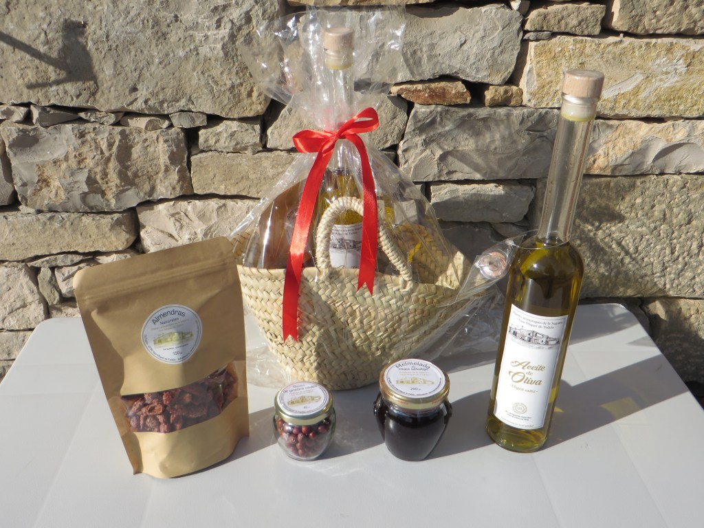 Descripción: 1 botella de aceite de 500 ml con su boquilla, 1 mermelada de higo de 200 grs, 1 bolsa de 150 grs de garrapiñadas